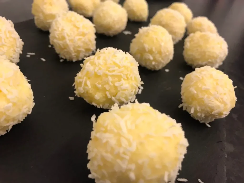A kész golyókat a maradék 50 g kókuszreszelékbe megforgatjuk.
